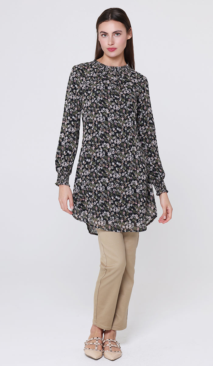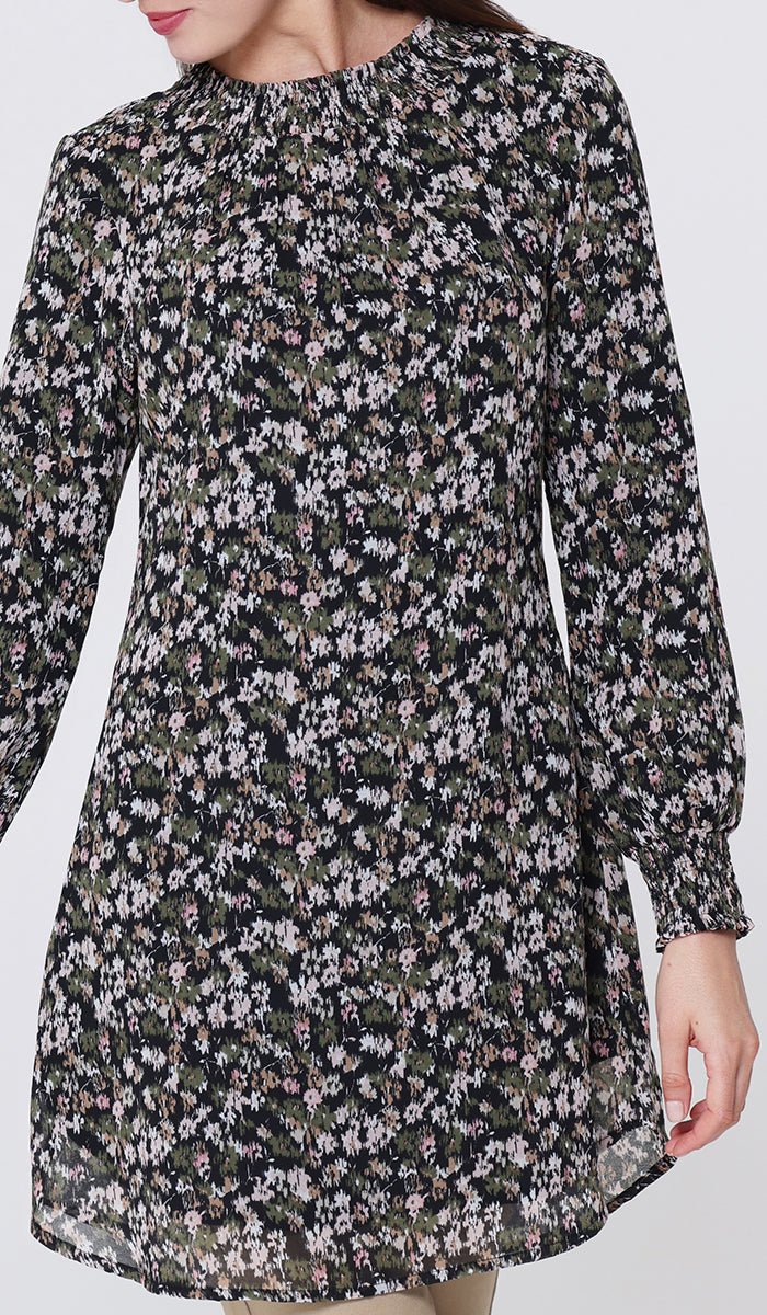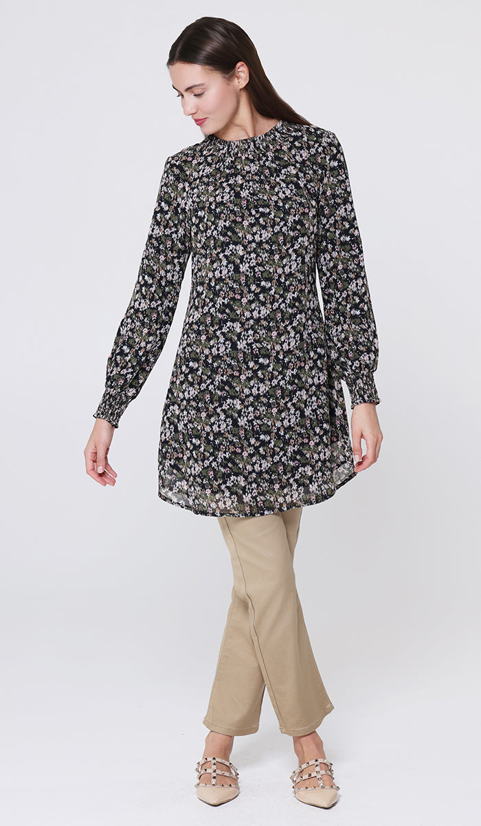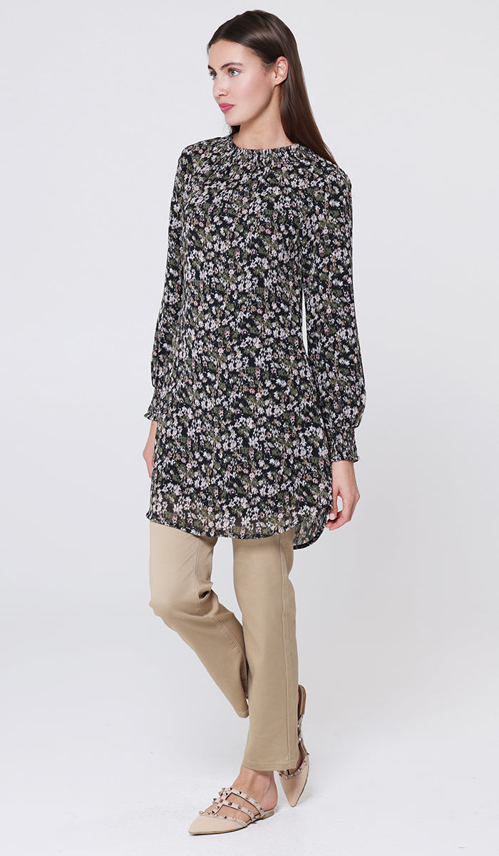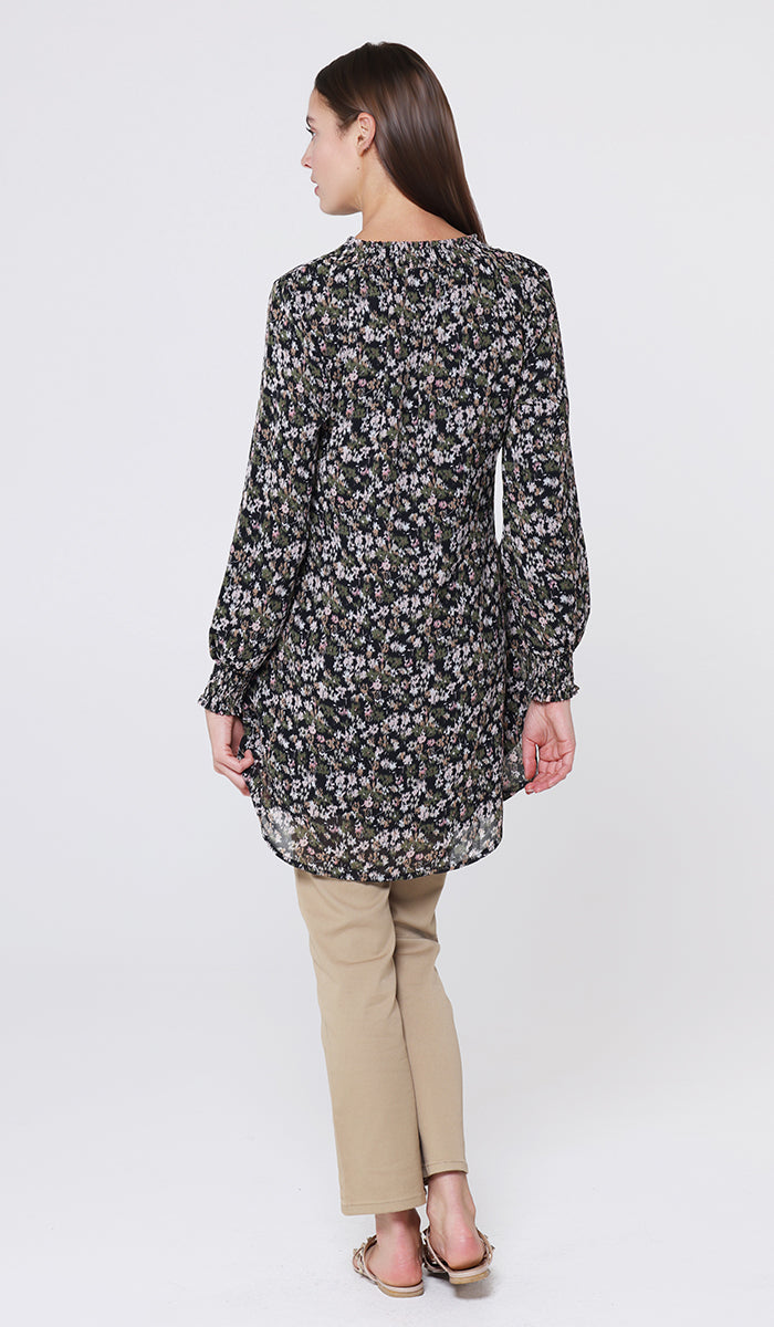Épanouissez-vous dans cette tunique douce et féminine. Encolure et poignets froncés confortables et élastiques pour un enfilage facile. Fabriqué dans un poly doux et fluide pour un minimum de tracas et un potentiel maximum.