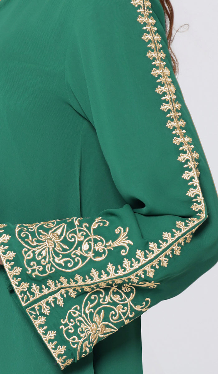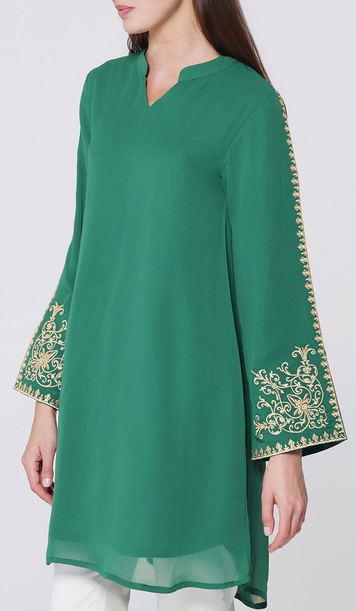 Meet Ruma—your new go-to when you want to look effortlessly put-together but still feel like you. This midi-length tunic is made from lightweight, floaty chiffon that moves when you do. And those gold embroidered sleeves? Instant main character energy.