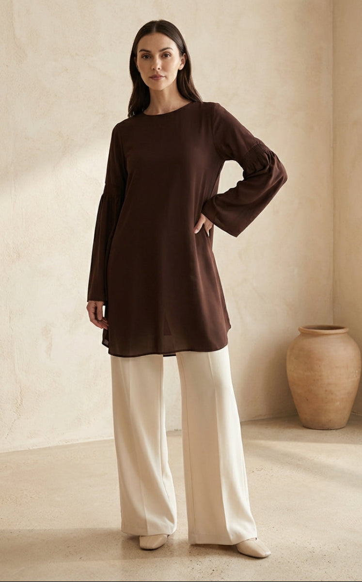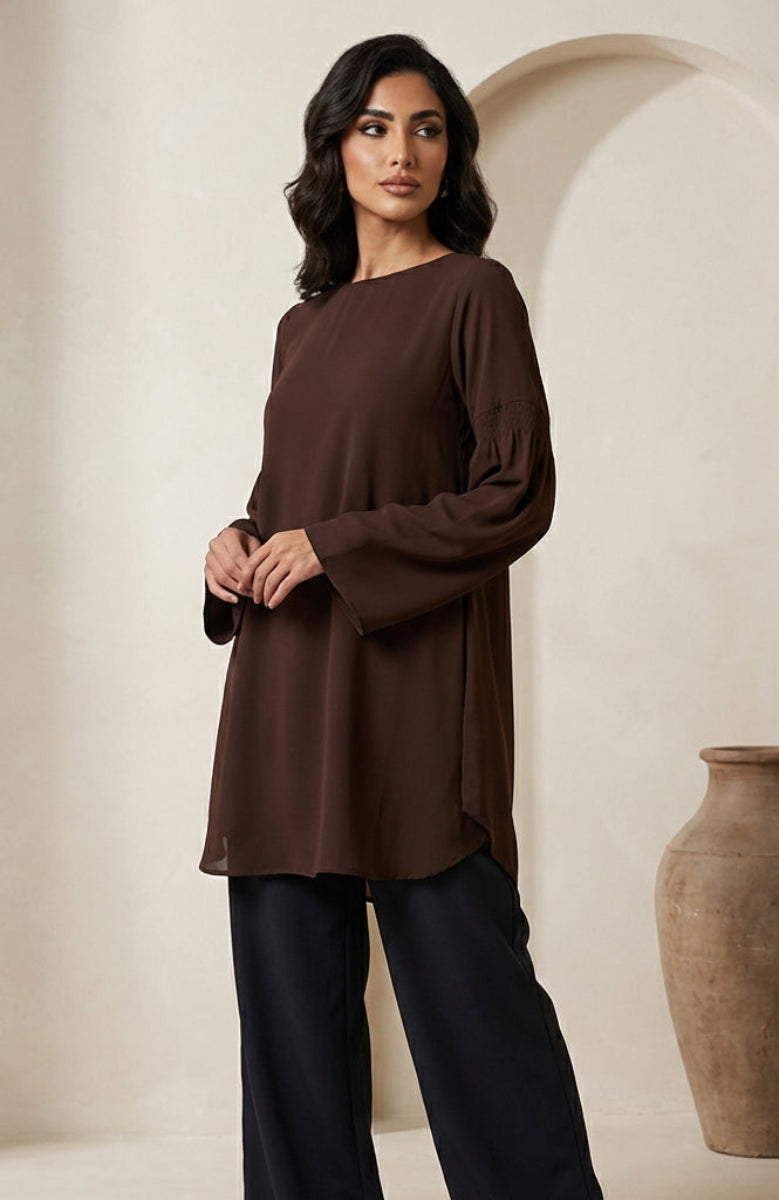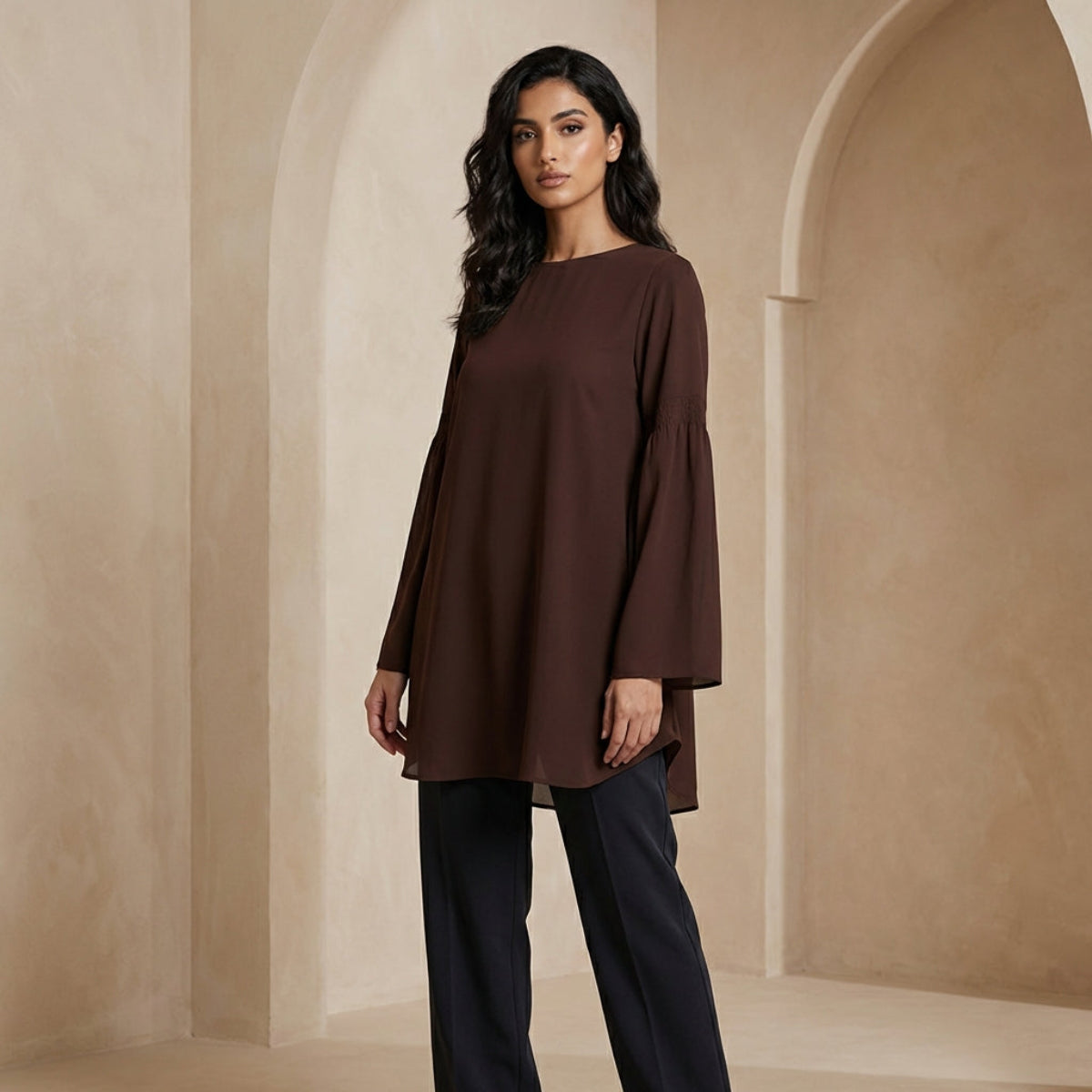 Be effortlessly stylish in the Sundus top, a must-have for your wardrobe. Crafted from lightweight chiffon, this versatile piece is is your easy answer for any occasion. Its comfortable, flared design is the perfect blank canvas for your unique style.